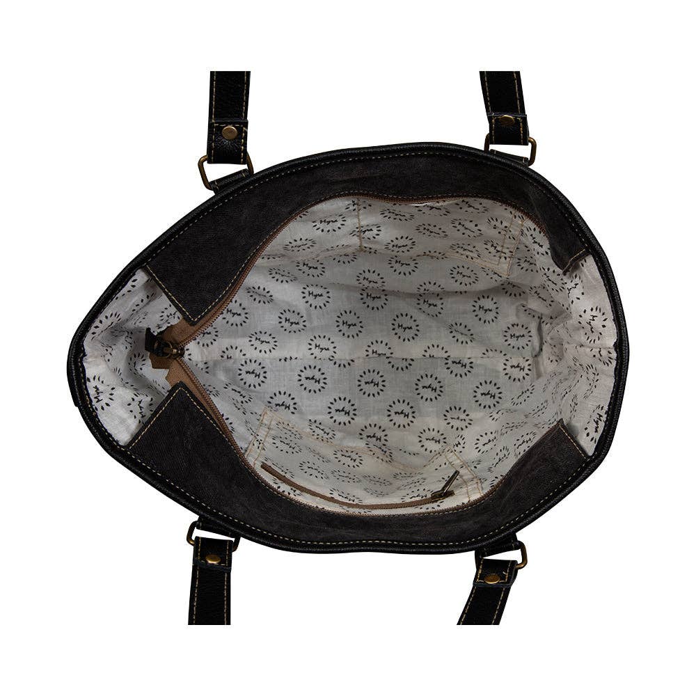 This beautiful bag features classic design elements. It starts with the gracefully scrolled panel of hand-tooled leather, outlined in onyx black leather. The beautiful hair-on hide extends to the side. The back is our popular smoky charcoal woven canvas and includes a zippered pocket. Spacious interior features a zippered pocket and zipper-close top. Matching leather shoulder straps are adjustable and removable.